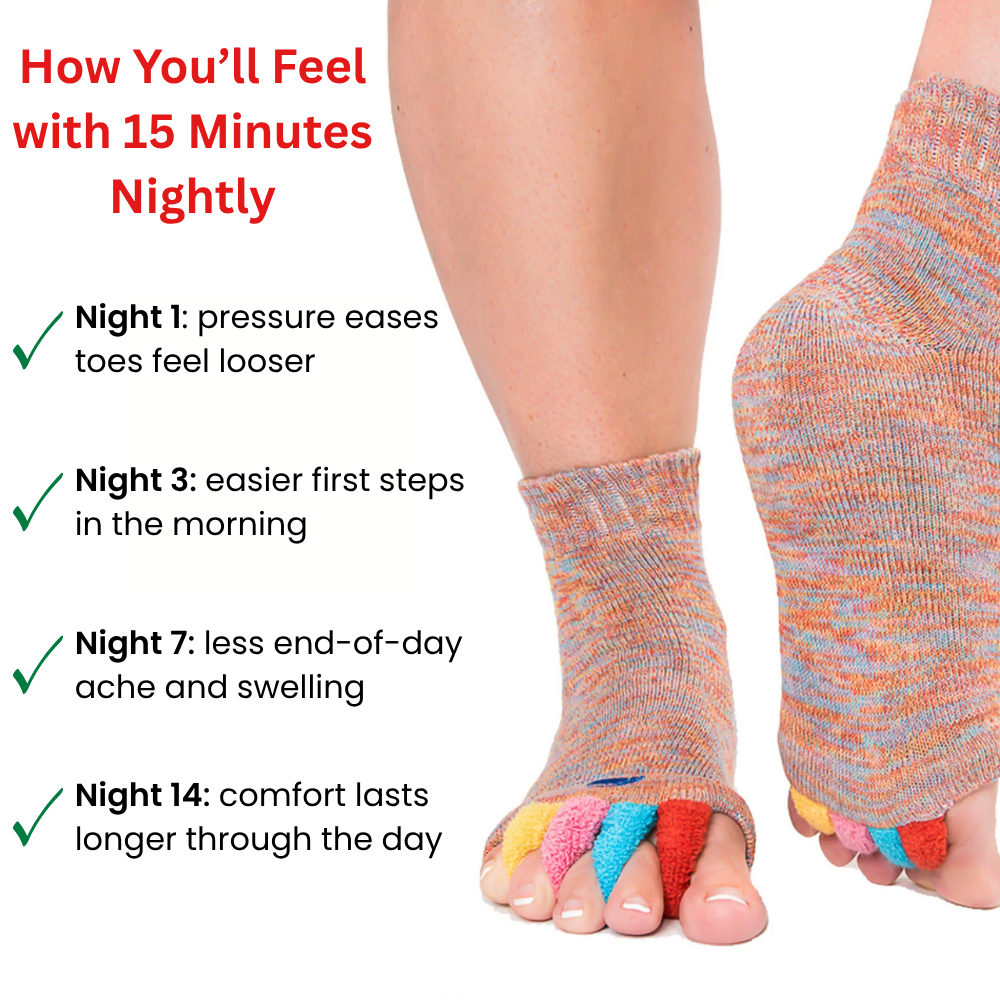 Five-toe separation gently pulls your toes back to their natural position while you sleep. This relieves pressure, improves circulation, and stops the overnight tightening that causes morning stiffness. Wear them for just 15 minutes a night or all night for deeper relief.